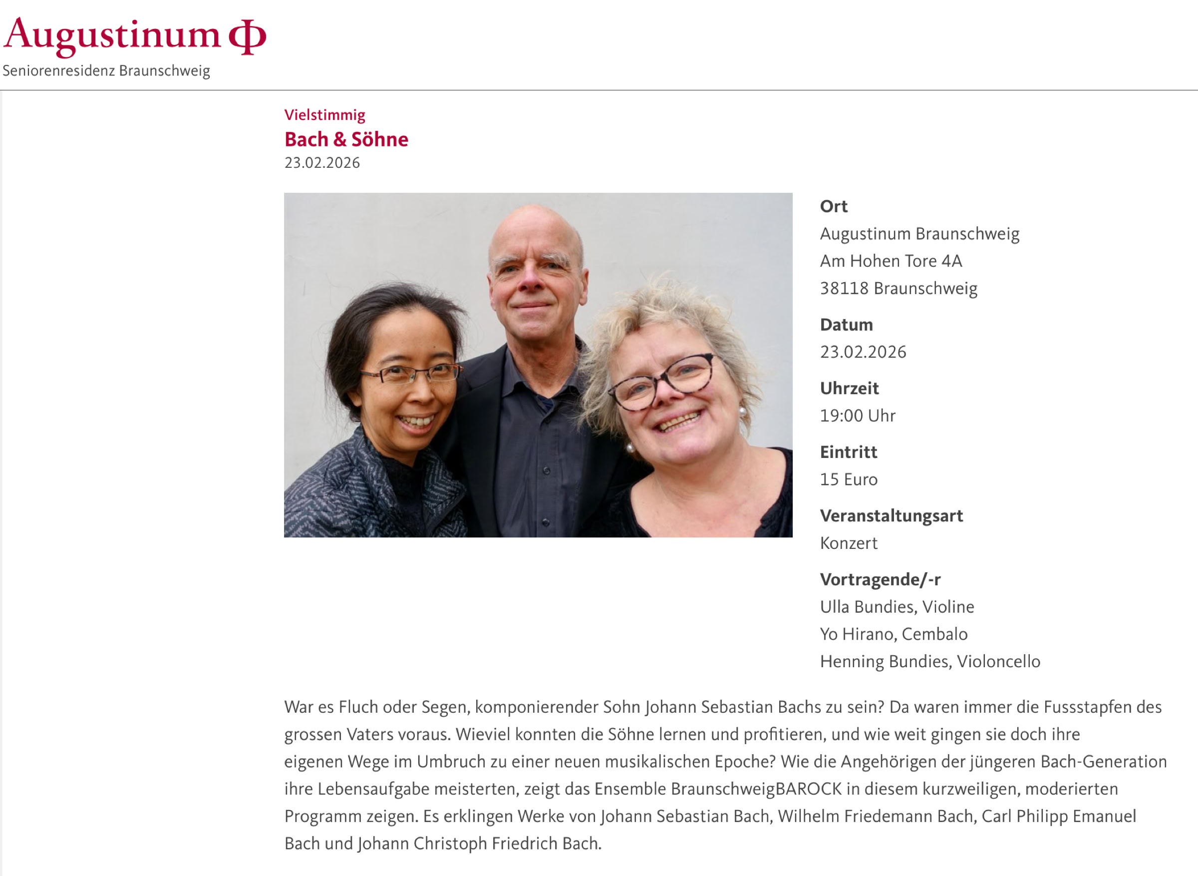 Die neuen, wieder sehr abwechslungsreichen Konzerte für 2026 sind vorbereitet! Wir freuen uns auf spannende Programme mit dem Trio Talan, dem Ensemble BraunschweigBAROCK, einem neuen Programm mit Cellosonaten, dem HIC-Trio und schliesslich wieder mit unserem traditionellen Benefizkonzert zum Jahresende.